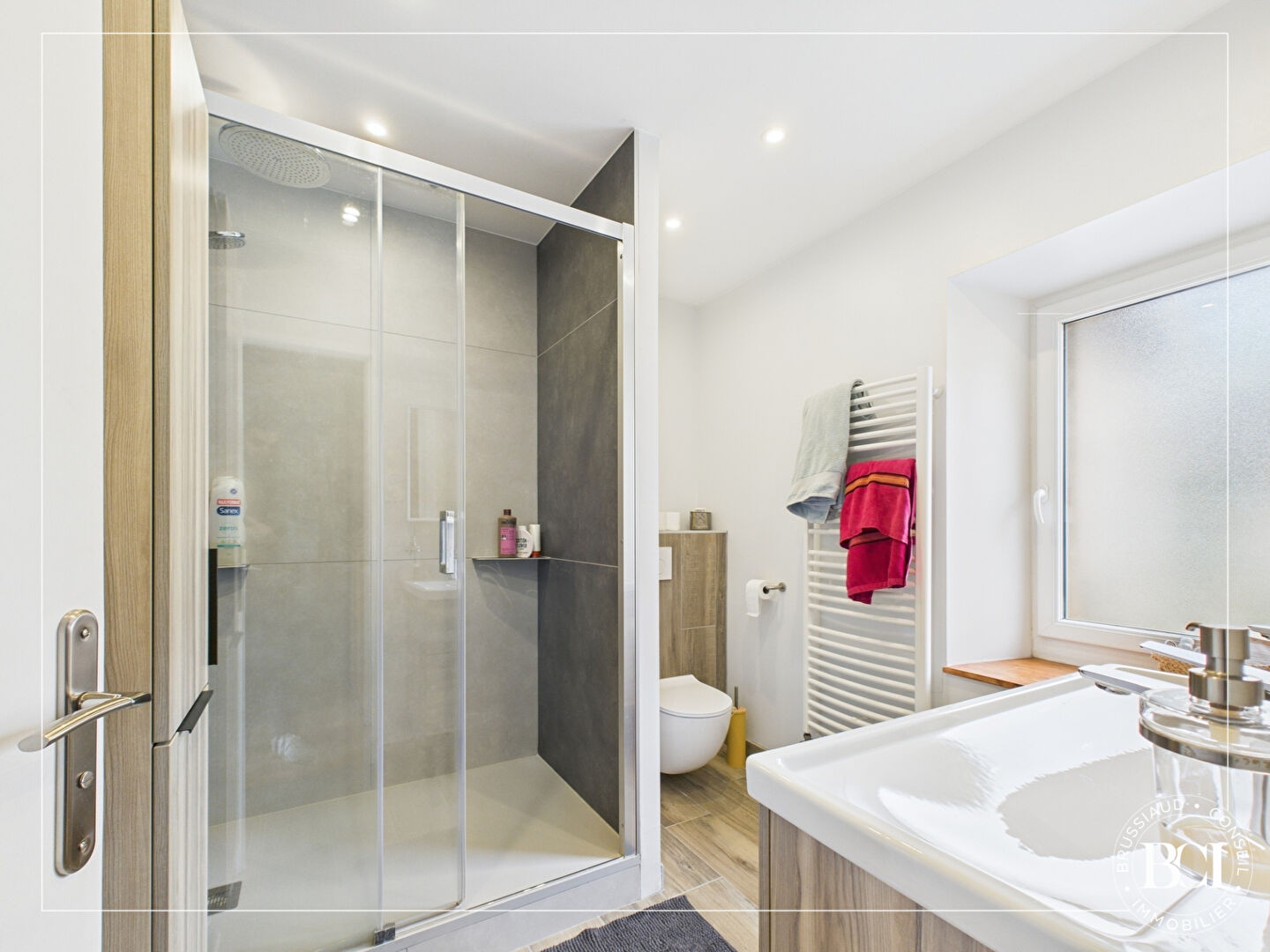 Au premier étage, vous trouverez une salle de bains entièrement rénovée avec une douche italienne et un wc suspendu.